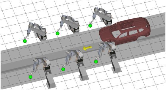 內(nèi)表面自動(dòng)噴涂站由4臺(tái)FANUC P-700iB噴涂機(jī)器人進(jìn)行車(chē)身內(nèi)表面的噴漆,4臺(tái)FANUC P-20iB機(jī)器人負(fù)責(zé)開(kāi)啟車(chē)門(mén),2臺(tái)FANUC P-25iB機(jī)器人負(fù)責(zé)開(kāi)啟引擎蓋和尾門(mén)。FANUC P-700iB機(jī)器人是專(zhuān)門(mén)為車(chē)身內(nèi)表面噴涂設(shè)計(jì)的柔性化機(jī)器人,其獨(dú)有的“Elbow-Up”和“Elbow-Down”兩種姿態(tài)特別適用于SUV等大型車(chē)的尾門(mén)內(nèi)部噴涂;FANUC P-20iB機(jī)器人同樣配備了“磁鐵式”、“插針式”、“船槳式”等多種開(kāi)門(mén)器,可以滿(mǎn)足不同材料車(chē)門(mén)的開(kāi)啟;FANUC P-25iB機(jī)器人配備“吊鉤式”開(kāi)蓋器打開(kāi)引擎蓋和尾門(mén)并通過(guò)力矩對(duì)引擎蓋和尾門(mén)的位置實(shí)時(shí)檢測(cè),避免噴涂過(guò)程中發(fā)生碰撞。
